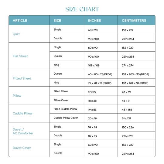 | Duvet Covers | Single | 60" X 90" |